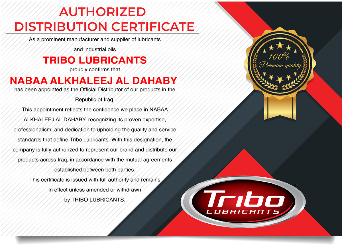NABAA ALKHALEEJ AL DAHABY has been designated as the Official Distributor of our products in the Republic of Iraq. This recognition is given by virtue of the trust placed in the aforementioned company, due to its trajectory, professionalism and commitment to the high standards of quality and service that characterize TRIBO LUBRICANTS